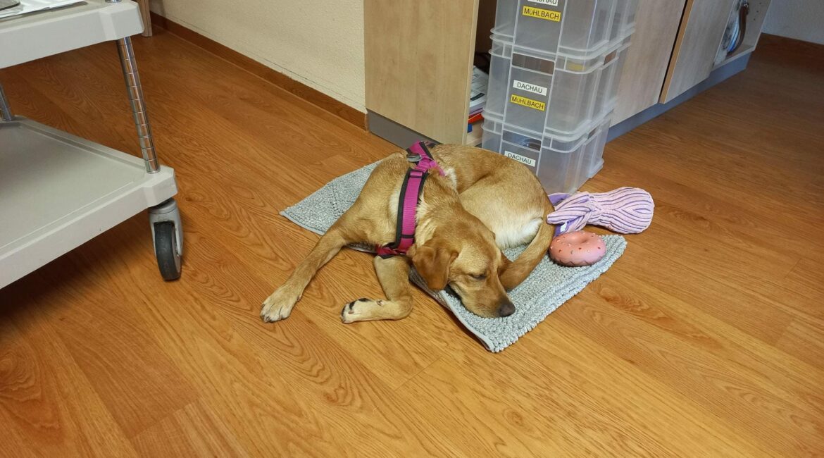 Eine Frau hat ihr Essen mit mir geteilt, es gab Semmel mit Butter und Marmelade….war lecker, aber dann hat Friederike mich gerufen, weil wir in einen anderen Raum gehen mussten. Dort war es laaaangweilig, weil die Leute nur gequatscht haben (das waren Kollegen von Friederike). Ich musste dann so dringend raus, aber Friederike war dauernd beschäftigt, da hab ich einfach am Flur….hat aber außer Friederike keiner mitbekommen (hihi, Glück gehabt). Naja, Friederike hat mein Geschäft in 2 Tüten gepackt (eine kleine schwarze und eine gaaaanz große blaue). Eine Frau, die gerade sauber gemacht hat, und die blaue Tüte aufgemacht hat, hat gerufen, dass es ganz fest stinkt. Friederike und ich haben dann mal lieber einen alten Mann besucht…..Kurz bevor wir nach Hause gefahren sind, hab ich nochmal mit 2 Kollegen von Friederike in den Frühstücksraum geguckt, und da war wieder die Frau in dem Stuhl mit den Rädern und hat sich so gefreut, mich zu sehen, dass die ihren Kuchen mit mir geteilt hat, der war auch lecker. Zu Hause haben Friederike und ich erstmal geschlafen, weil wir beide sooo müde waren. Das war ein sehr aufregender und essensreicher Tag. Viele Grüße, Josie.